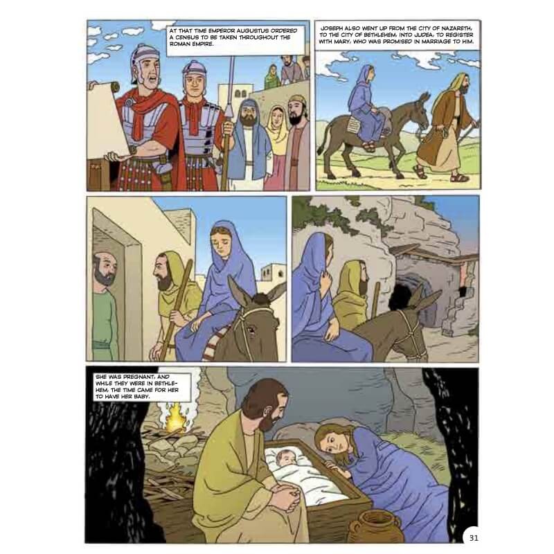 Bogen er lavet som en tegneserie, der først genfortæller få udvalgte beretninger fra Det Gamle Testamente og derefter formidler den historien om Jesus fra hans fødsel til himmelfart. Man kan læse om: